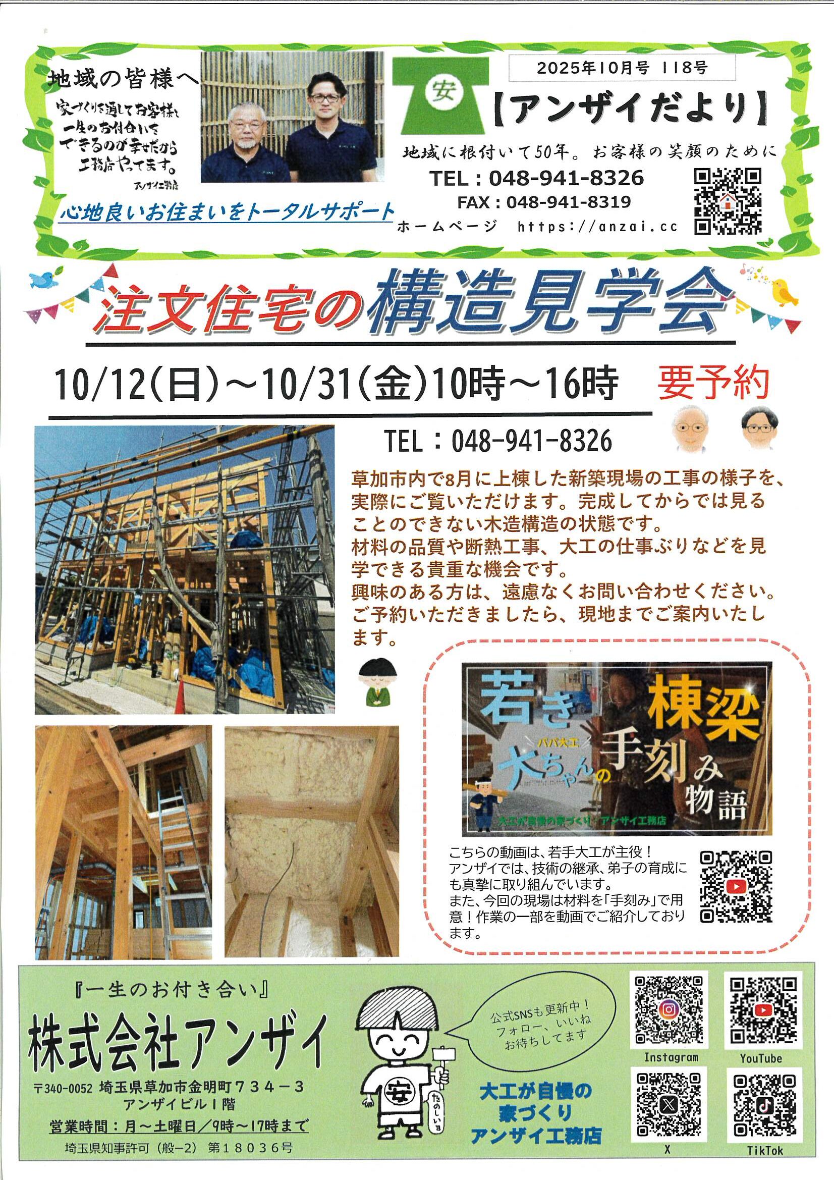 アンザイだより118号では、表面に現在工事中の「構造見学会」をご案内。