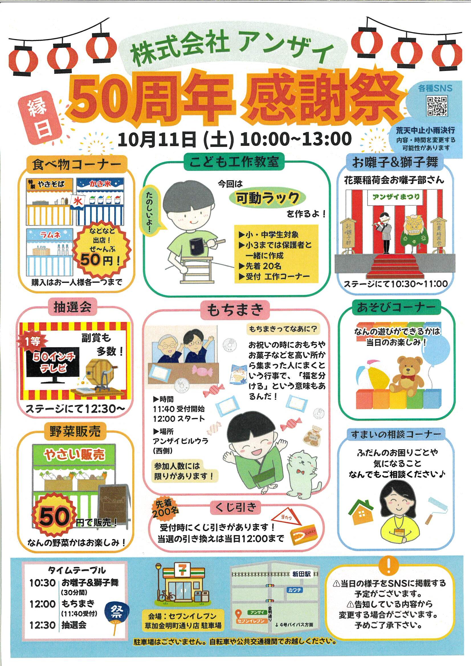 裏面には、アンザイ50周年特別企画「アンザイ大感謝祭」のお知らせです。50周年にあやかって、50円で提供するものがいっぱい!焼きそば、かき氷、フランクフルト、野菜販売などなど。さらに、抽選で50インチテレビが当たる「抽選会」や、今では珍しくなった「もちまき」も行います。