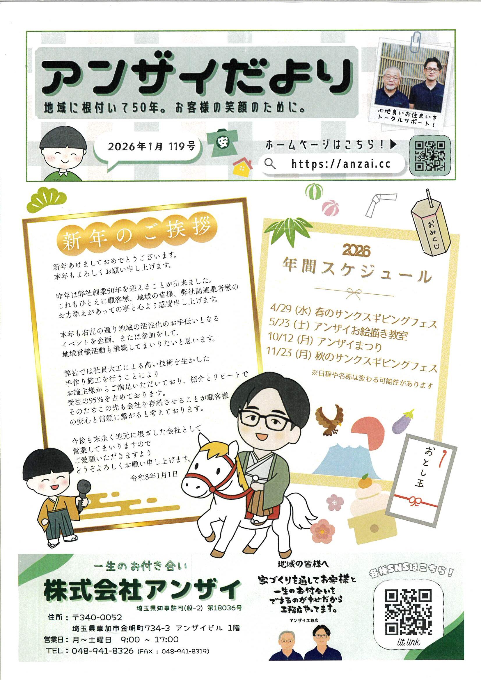 アンザイだより119号では、表面に社長の挨拶と、本年の「イベントスケジュール」を掲載させていただきました(あくまで予定ですのでご承知おきください)。今年も工作教室やアンザイまつりで、地域の皆様と交流できることを楽しみに、今から少しづつ企画を練っております。